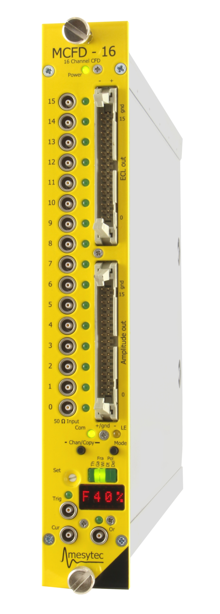 mesytec MCFD-16 is an easy to use, fast 16 channel constant fraction discriminator (CFD) for high timing resolution applications. It provides fast amplifiers at the inputs which can be set for input polarity and gains. The amplifier outputs are split to the CFD unit and are available as unipolar or differential signals (configurable) at an output connector. The discriminator signals are available as ECL differential outputs at a 34 pin header connector. In differential mode, the analogue outputs allow to drive long twisted pair cables to introduce the necessary delay needed for charge sensitive ADCs (QDCs). A fast pattern processing is implemented, well suited to produce complex triggers from input coincidences. An optimised type (MCFD-16-fast) for signal rise times below 2 ns is available.
