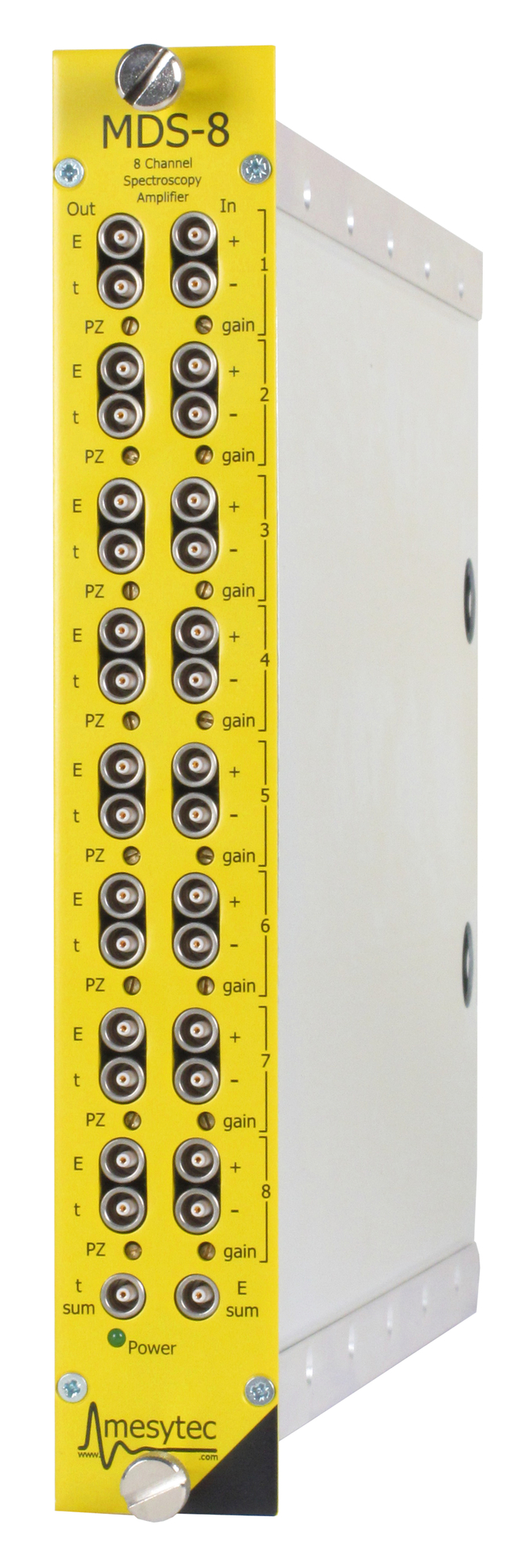 mesytec MDS-8 is an 8 channel spectroscopy amplifier with integrated timing filter amplifier in a 1/12 wide NIM module.