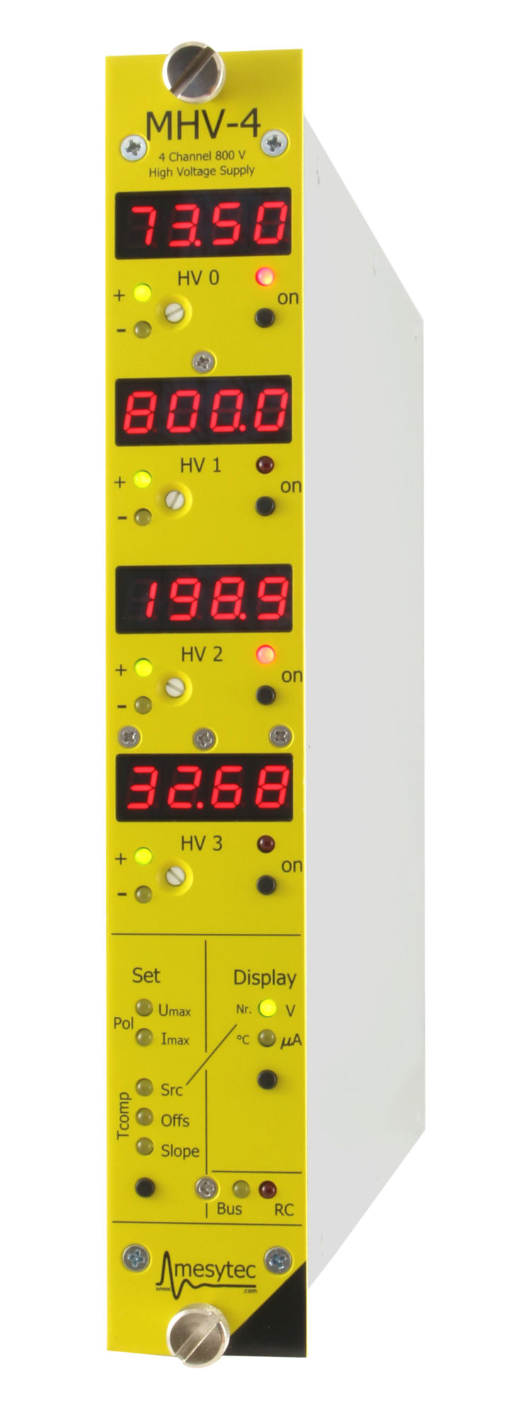 mesytec MHV-4 is a modern 4-channel high precision bias supply unit for detector bias voltages up to 800 V. It is designed to supply highly stable bias voltage for all types of silicon and gas detectors. The output current is limited to 20 uA.