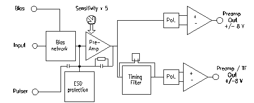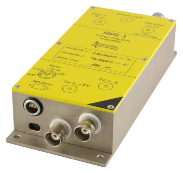 mesytec MPR-1 is a charge integrating preamplifier module. It provides two outputs which can be jumpered to different or same polarity. One can be configured as timing filter output. Both can drive terminated BNC cables. The sensitivity can be changed by a factor of 5 via front panel switch. This helps to get larger signals at low charge deposition. MPR-1 is available with Lemo, BNC, MHV, and SHV connectors.