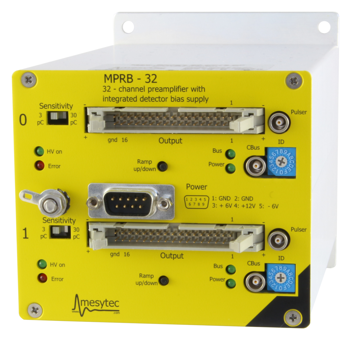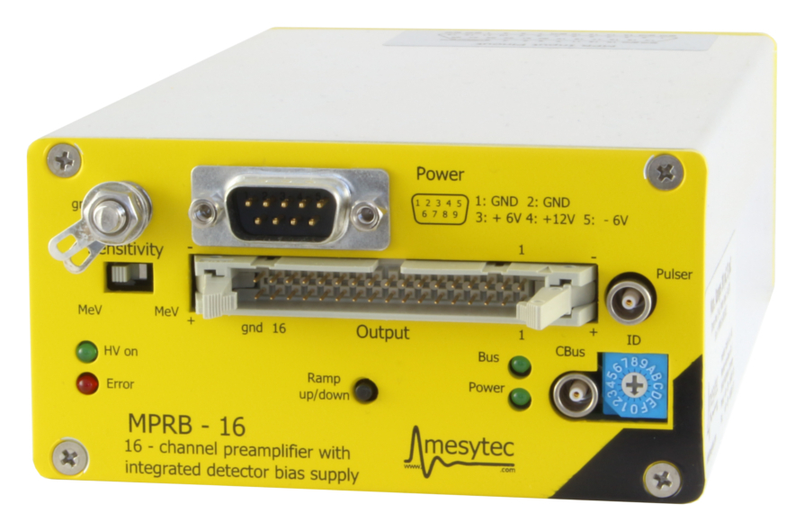 mesytec MPRB-16 is a 16 channel charge sensitive preamplifier with integrated bias voltage generators. The device is remote controllable via mesytec control bus, which allows to adjust the 16 bias voltages individually for each channel in 100 mV steps, up to 600 V. It is designed to operate and read out arrays of avalanche photo diodes or strip detectors. A temperature sensor can be connected and allows the MPRB-16 to compensate the APD gain drift with temperature by adapting the bias voltage with temperature. All parameters can be set and read back via mesytec control bus.