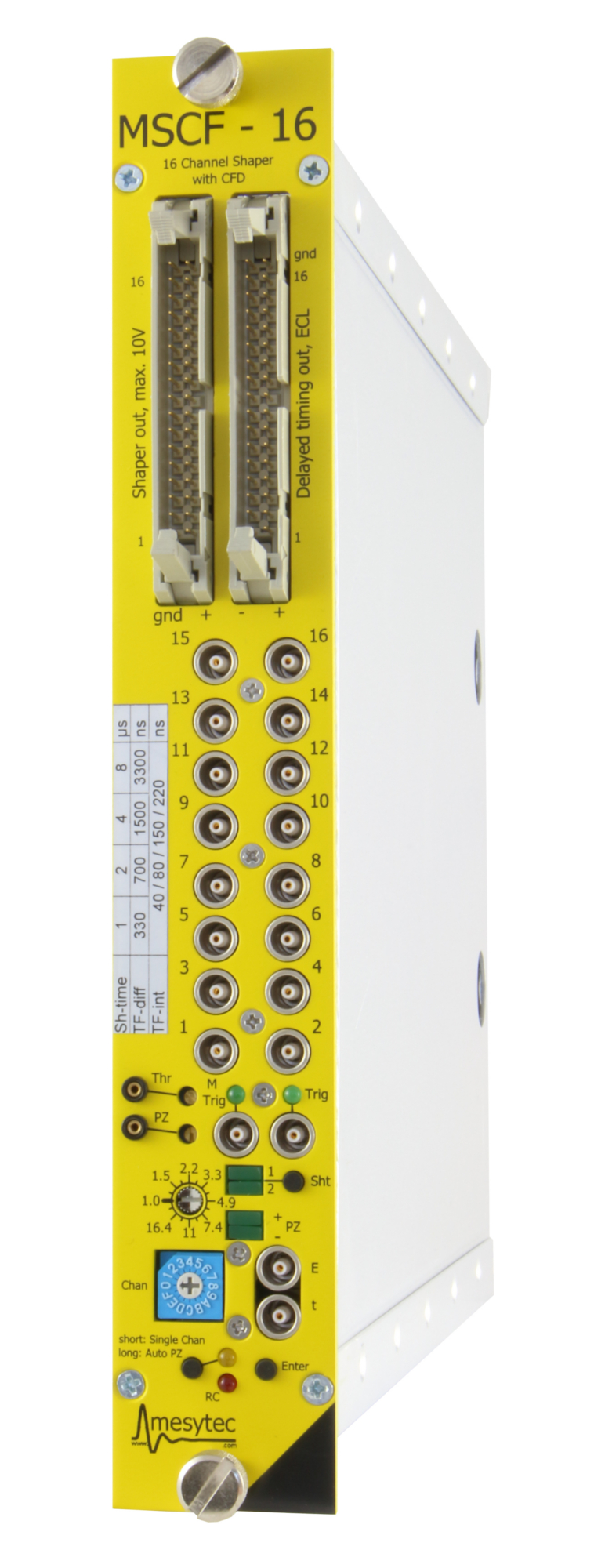 mesytec MSCF-16-LN is an ultra low noise spectroscopy amplifier with active baseline restorer. It provides timing filter amplifiers with constant fraction discriminators and a multiplicity trigger. It is completely revised to meet the requirement of high quality germanium detector readout.