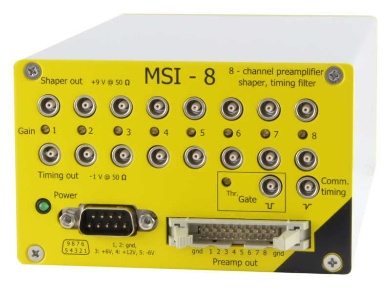 mesytec MSI-8 is a compact 8 channel preamplifier shaper box with integrated timing filter amplifiers. Due to the modular setup, preamplifier and shaper module types can be selected individually for each channel. MSI-8 is the ideal solution for setups with a mix of different detectors requiring individual bias supply and energy ranges. It is also well suited for moderately segmented strip detectors or as an easy to use and flexible lab system.
