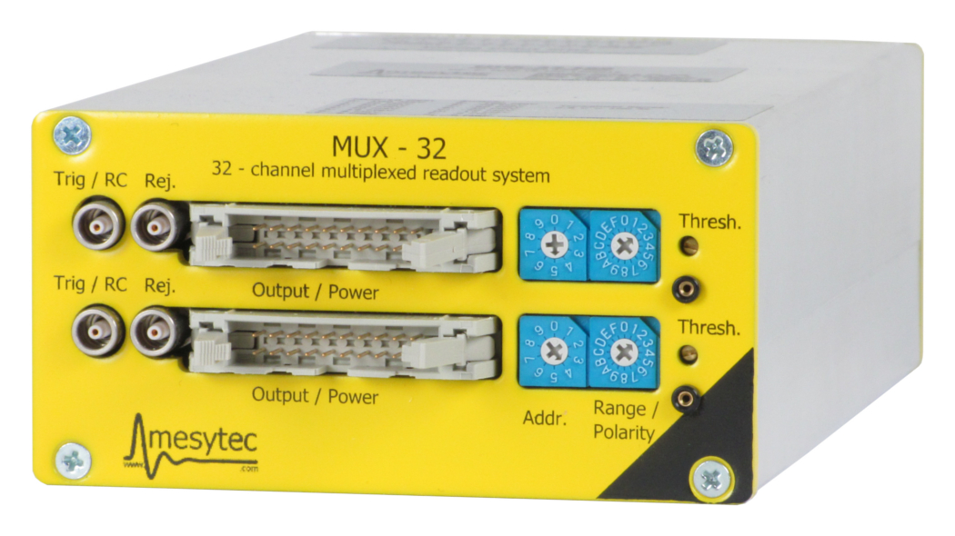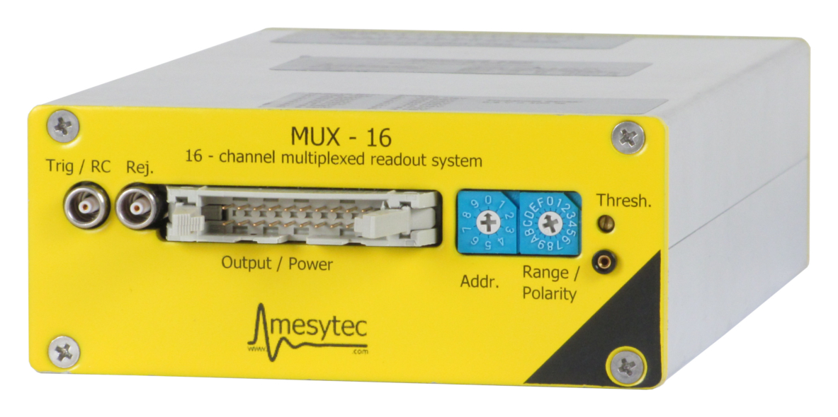 mesytec MUX-16 /-32 is a very fast 16 / 32 channel multiplexed preamplifier shaper and discriminator combination with very good energy and timing resolution. Up to two simultaneously responding channels are identified and two amplitudes plus the two corresponding amplitude coded addresses are switched to a bus. Up to eight modules (128 channels) can be connected to one bus, so only 4 channels of peak sensing ADCs are needed to digitize energy and position signals. The modules are especially well suited for single hit applications (maximum two hits on one module) with single or double sided multistrip silicon detectors or multiwire proportional chambers. Due to low power consumption the MUX-16 PCB can be used in vacuum without cooling.